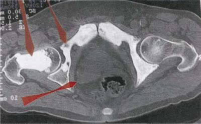 Los puntos óseos blancos (por ej. la flecha de arriba) son ex-osteolisis recalcificadas y muestran que el paciente, que ahora está de nuevo felizmente casado, ha resuelto positivamente su conflicto de autodesvalorización (“en el vientre ya no valgo nada”). Eso no excluye que (flecha de arriba a la derecha) no pueda sufrir una nueva y pequeña osteolisis coincidiendo con una nueva recaída en las zonas recalcificadas.