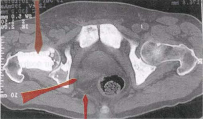 El lóbulo posterior, agrandado, de la próstata (flecha de abajo a la izquierda) está atravesando una tuberculosis líquida caseosa (sudor nocturno) y produce temporalmente un desplazamiento del recto de la posición central hacia la derecha.