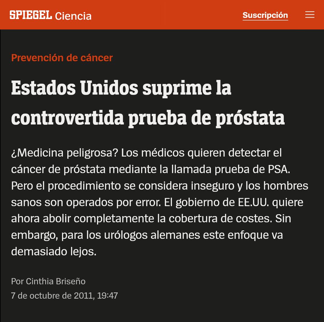 "La baja especificidad de la prueba de PSA , junto con su incapacidad para distinguir los tumores benignos de los agresivos, hace que un número considerable de hombres esté siendo sobrediagnósticado de cáncer de próstata", indicó el Grupo de Trabajo de Servicios Preventivos de Estados Unidos (US Preventive Services Task Force).